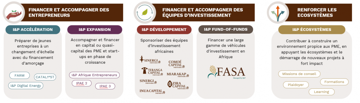 Aujourd'hui, les activités d’I&P s’articulent autour de cinq gammes d'activité : accélération, expansion, développement, fund-of-fund et écosystèmes. Ces gammes sont complémentaires et ont pour but de faciliter l'accès au financement pour les entrepreneurs africains, en oeuvrant sur trois axes : financer et accompagner directement les entrepreneurs (financement d’amorçage, capital-investissement), soutenir et développer des équipes d'investissement africaines, et renforcer l’écosystème entrepreneurial.