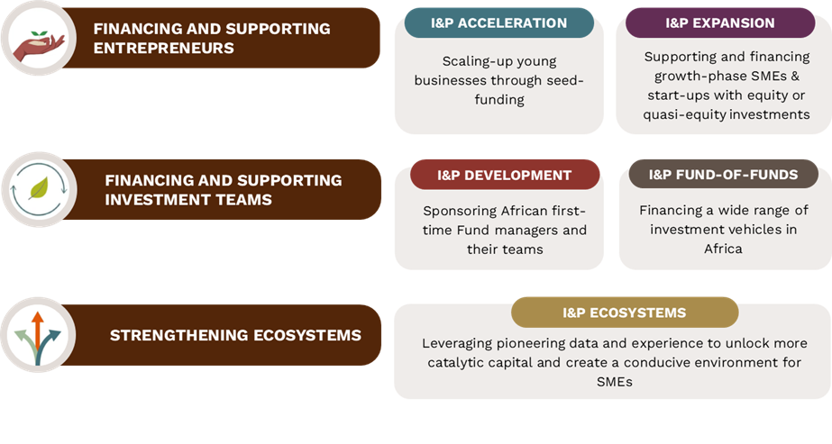 I&P's activities are structured around three key pillars to facilitate access to financing for African entrepreneurs: directly financing and supporting entrepreneurs (seed funding, private equity), launching and investing in African fund managers, and strengthening the entrepreneurial ecosystem.