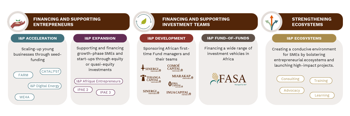 I&P's activities are structured around three key pillars to facilitate access to financing for African entrepreneurs: directly financing and supporting entrepreneurs (seed funding, private equity), supporting and developing African investment teams, and strengthening the entrepreneurial ecosystem.