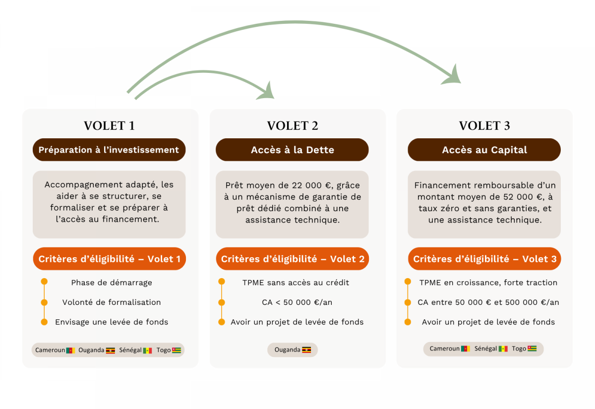 Le programme est déployé par 3 équipes partenaires du réseau de fonds d’impact africains sponsorisés par I&P (qui financent et accompagnent les très petites et moyennes entreprises à fort potentiel de croissance) : Comoé Capital en Côte d’Ivoire pour le Togo, Fako Capital au Cameroun et Teranga Capital au Sénégal.